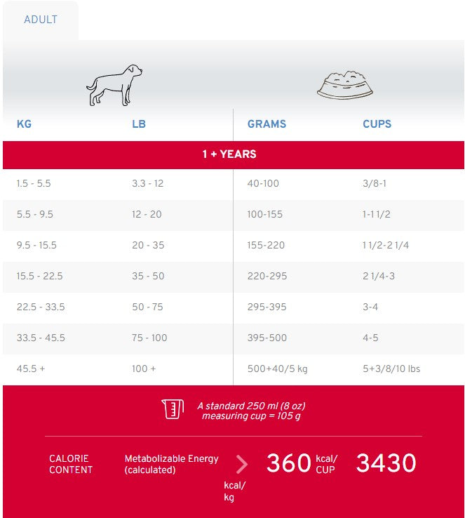 Proteína bruta 22% mínimo, grasa bruta 12% mínimo, fibra bruta 5,5% máximo, humedad 10% máximo, cenizas 8% máximo, calcio 1,2% mínimo, fósforo 0,8% mínimo, sodio 0,28% mínimo, vitamina A 12.500 UI/kg mínimo , vitamina D31150 UI/kg mínimo, vitamina E 80 UI/kg mínimo.